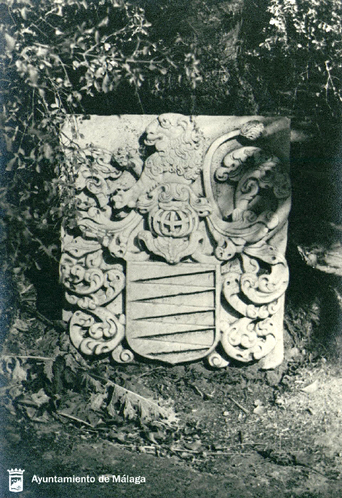 - Escudo de la Familia Sweerts, originaria de Flandes, que se asienta en Málaga en el siglo XVII. En el siglo XVIII españoliza su apellido por el Suárez, construyendo la Hacienda de Suárez, origen de la barriada Suárez de Málaga. El escudo estuvo en los jardines, cuando fue fotografiado por Temboury. En la actualidad está desaparecido