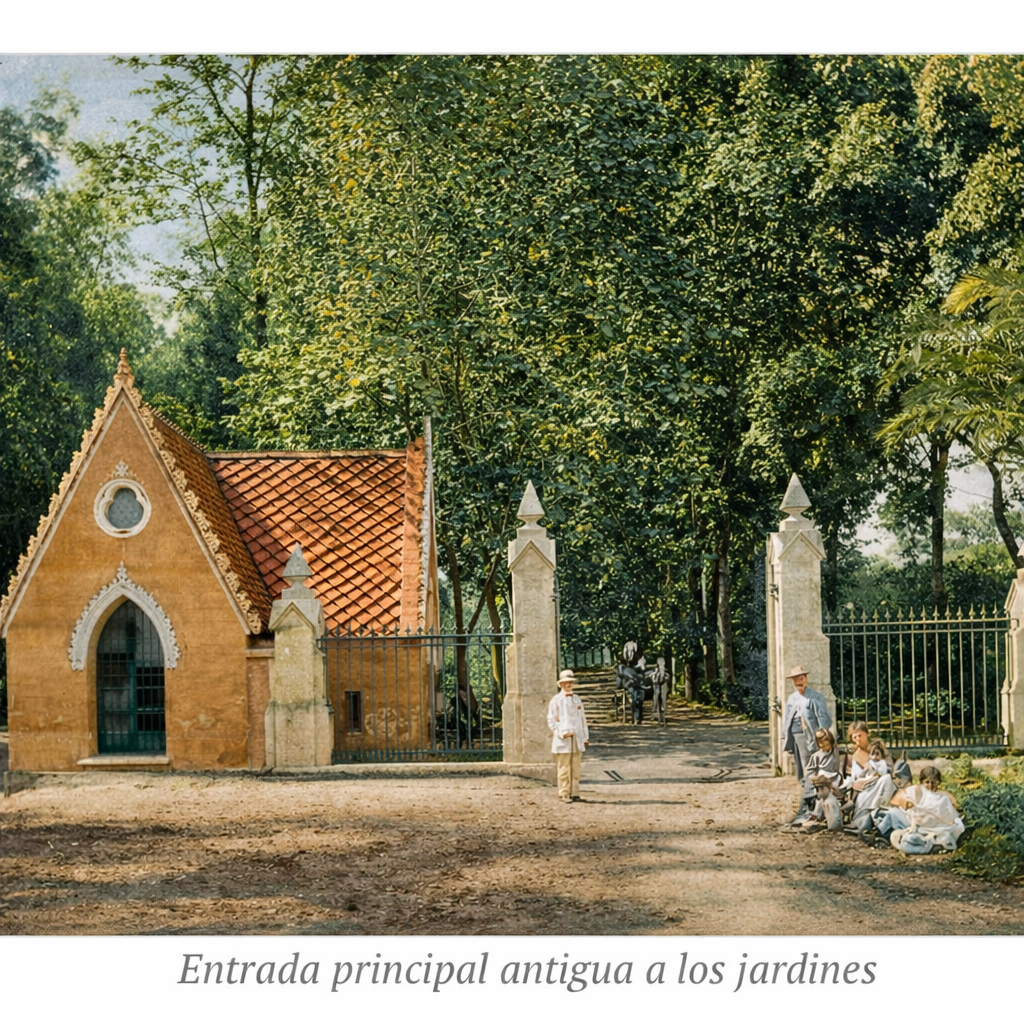 Después de pasar la magnífica puerta de hierro que da entrada a la Hacienda, se encuentra la portería, que es de estilo ojival muy elegante. La avenida o camino de árboles que conduce al palacio, está adornado con Platanus orientalis para sombra.