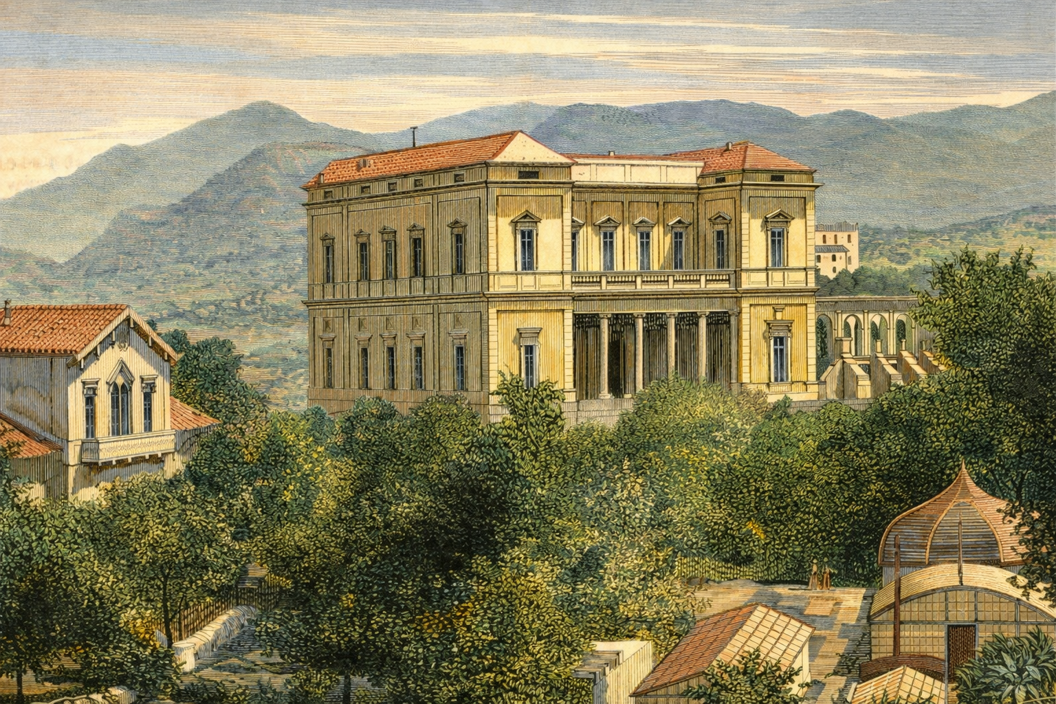 - Estampa de la hacienda del año 1878 con el palacio, la casa de labor, los jardines e invernaderos
