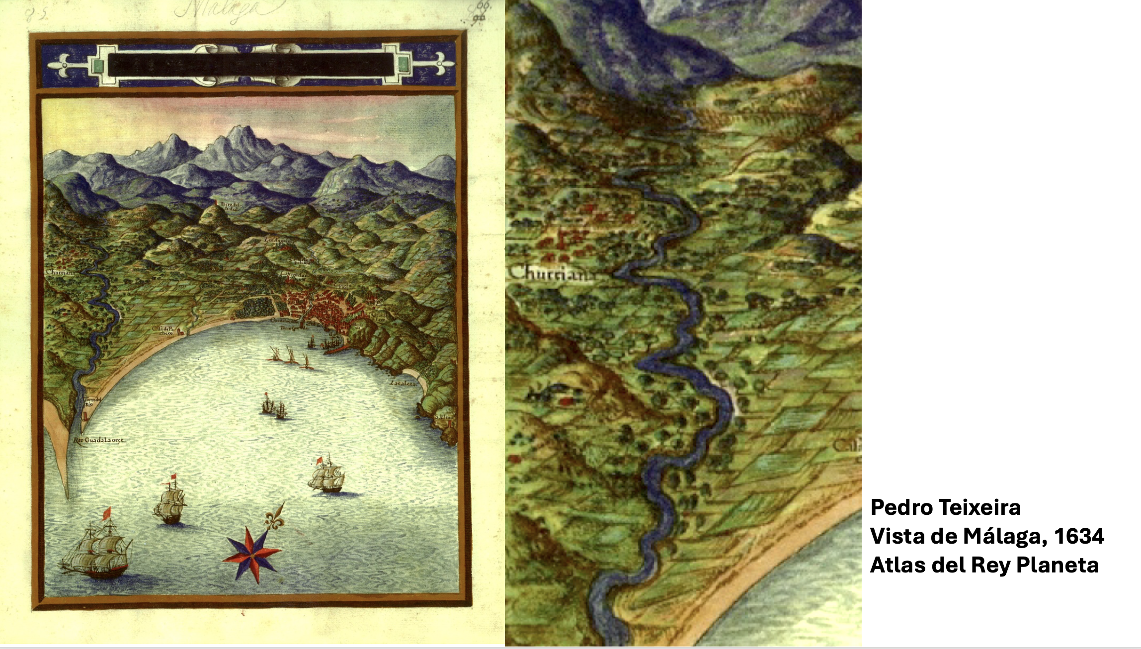 1. 1634. Fecha de la Vista de Málaga de Pedro Texeira, en la que aparece el nombre de Churriana, como referencia del terreno ubicado entre el río Guadalhorce y la Sierra de Mijas.