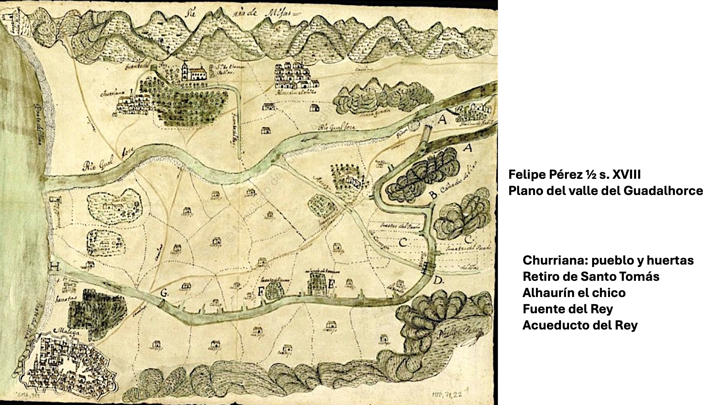 2. Mediados del siglo XVIII, cuando la población de Churriana, las huertas de Santo Tomás, Alhaurín el Chico, la Fuente del rey y el Acueducto del Rey aparecen en un plano del arquitecto Felipe Pérez.