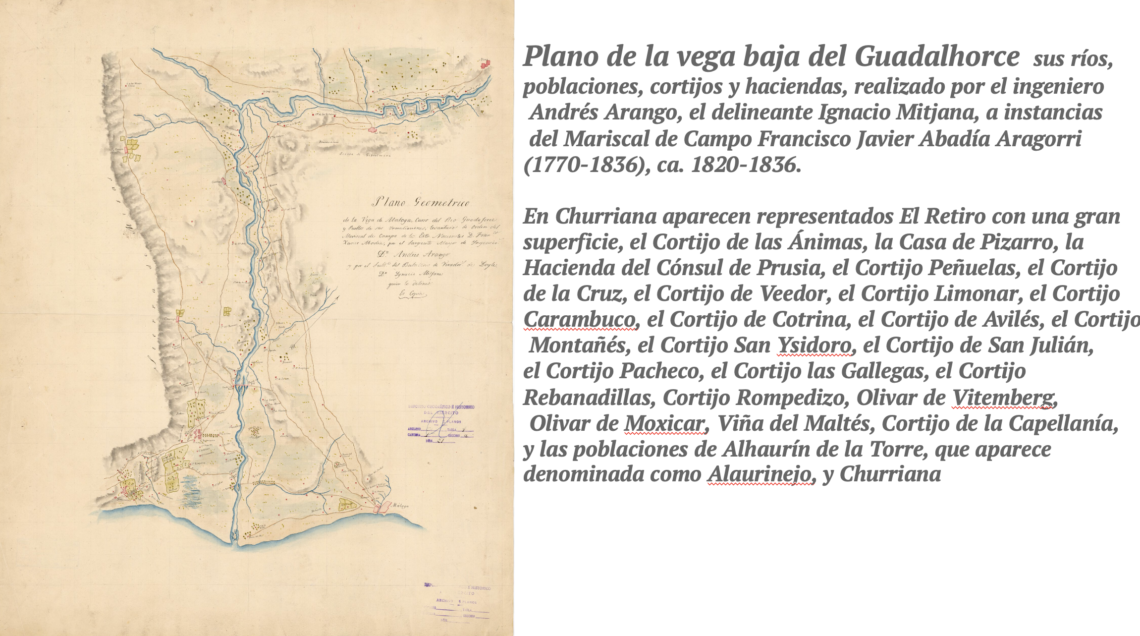 3. 1836. En este año está fechado el Plano de la vega baja del Guadalhorce sus ríos, poblaciones, cortijos y haciendas, realizado por el ingeniero Andrés Arango, el delineante Ignacio Mitjana, a instancias del Mariscal de Campo Francisco Javier Abadía Aragorri (1770-1836), ca. 1820-1836. En Churriana aparecen representados El Retiro con una gran superficie, el Cortijo de las Ánimas, la Casa de Pizarro, la Hacienda del Cónsul de Prusia, el Cortijo Peñuelas, el Cortijo de la Cruz, el Cortijo de Veedor, el Cortijo Limonar, el Cortijo Carambuco, el Cortijo de Cotrina, el Cortijo de Avilés, el Cortijo Montañés, el Cortijo San Ysidoro, el Cortijo de San Julián, el Cortijo Pacheco, el Cortijo las Gallegas, el Cortijo Rebanadillas, wl Cortijo Rompedizo, el Olivar de Vitemberg, el Olivar de Moxicar, la Viña del Maltés, el Cortijo de la Capellaníam y las poblaciones de Alhaurín de la Torre, que aparece denominada como Alaurinejo, y Churriana.