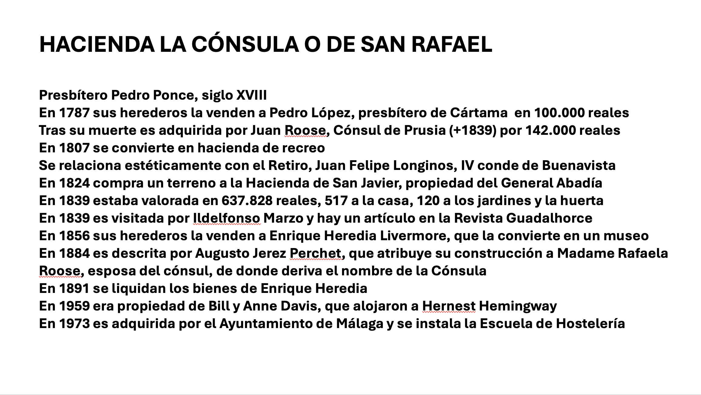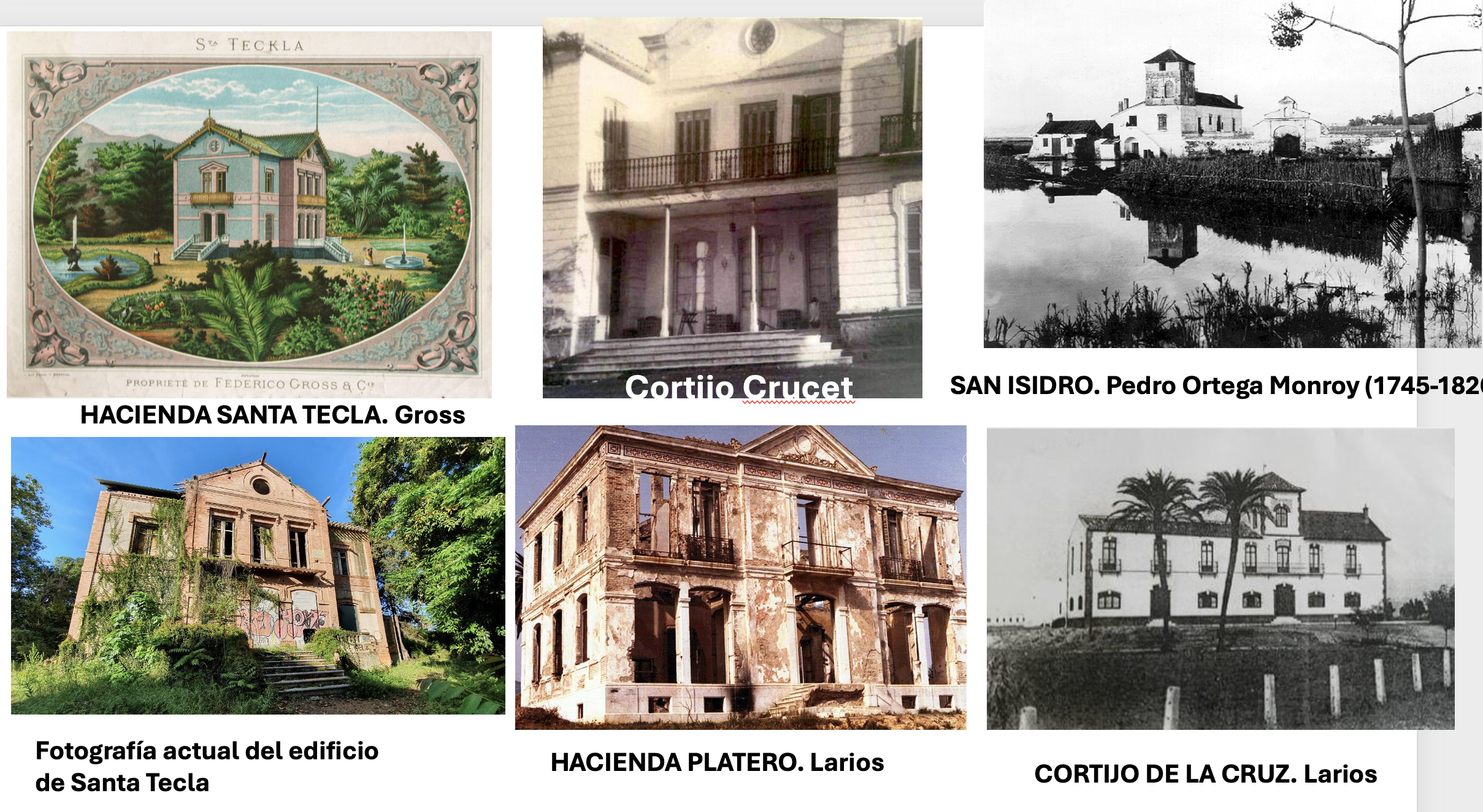 En esta relación aparecen destacadas las denominadas quintas de recreo y las haciendas, que contaban con jardín y una vivienda importante: el Retiro, la Cónsula o quinta de San Rafael, San Javier, propiedad de Manuel Piédrola, la Toca, Carambuco, la Havilla, la Concepción, quinta de Gross, huerta de Santa Tecla, la hacienda del Platero, propiedad de Juan Larios. Jerez Perchet hace una breve descripción de la hacienda: Ocupa la casa principal, que es de correcto dibujo, una pequeña eminencia y merece una visita, la misma que sus jardines, en los que hay como caprichosa curiosidad, una extensa galería o túnel de durantes. Casa de recreo de José Sánchez, dos quintas de recreo de difícil lectura, a las que habría que sumar las de Gerald Brenan y la de la familia de Moreno Villa. Llama la atención que la familia Gross poseía dos casas destinadas a la industria del secado de higos y pasas, una quinta de recreo y la huerta de Santa Tecla. En una de las etiquetas de estos frutos secos se puede leer el siguiente texto: «Federico Gross y Cia. Málaga. Colonia Sta. Tecla». Desconocemos si los restos arquitectónicos de la mansión pertenecían a la Quinta Gross de Recreo o a la denominada huerta de Santa Tecla, con cuyo nombre se suelen asociar actualmente. Otra de las haciendas más importante era la Hacienda Crucet, propiedad de la condesa viuda de Nájera, que en 1930 colocó con el permiso del Ayuntamiento de Málaga una escultura de la Inmaculada en la Plaza de la Higuereta, la cual ha dado hoy nombre a dicha plaza (Archivo Municipal de Málaga, Actas Capitulares, año 1930, vol 332). En 1961 la hacienda, entontes propiedad de las Misioneras de Jesús, María y José, fue expropiada para las pistas del aeropuerto.