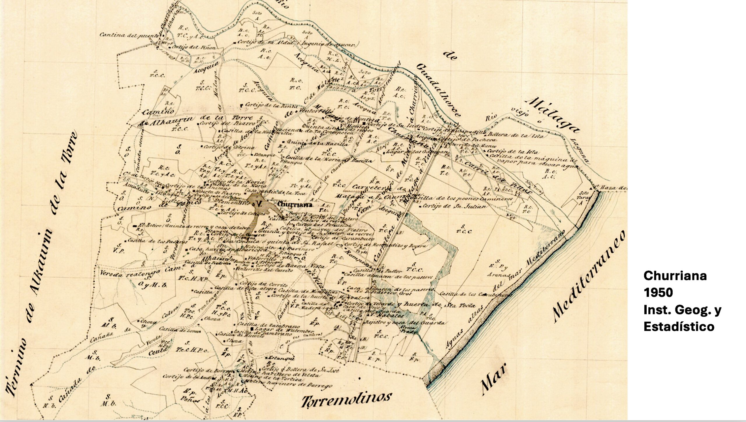 4. 1950. En un plano firmado por el oficial del Cuerpo de Topógrafos Lorenzo López el 22 de julio de 1950, que recoge la orden del Ministerio de Gobernación de 27 de octubre de 1905, por el que el término municipal de Churriana se fusiona con el de Málaga, aparece lo que era el territorio de Churriana limitado al este por el río Guadalhorce, al oeste por el termino de Torremolinos, al sur por el Mediterráneo y al norte por el término de Alhaurín de la Torre. En el centro aparece el núcleo urbano de Churriana rodeado por los numerosos cortijos existentes con sus nombres antes de que empezara su reconversión en terrenos urbanos. Se pueden leer los siguientes nombres de oeste a este: Cortijo y Bollera de San José, Cortijo de Borrego, Cortijo de San Andrés, Cortijo de Velarde y huerta de San José, lagar de Wutemberg, casa almacén de los paseros de Federico Gross, Cortijo de la huerta de Monzalvez, Cortijo del Corrito, Cortijo de Buenavista, Cortijo de Rompedizo y Boyera, la Cónsula o quinta de San Rafael, casa huerta de Albaricoca, Quinta y Cortijo de San Javier de Recreo, Cortijo de Carambuco, el Retiro (Quinta de recreo y casa de labor, estanque), casita del Platero de recreo, Cortijo las Peñuelas, Cortijo de la Gamera, Cortijo de Colitre, casilla de la Noria de Platero, casilla del Platero de recreo, Cortijo de San Julián, casa jardín de la Toca, huerta de Pizarro (cortijo, casa labor), cortijo y casilla de la Noria, Cortijo de las Ánimas, huerta de Pizarro, cortijo de Cotrina, casilla de la Huertecilla, Quinta de la Havilla, Hacienda de la Concepción, Quinta de Gross de recreo, Cortijo de Montesa, Cortijo de San Isidro, Cortijo de Re(…)padilla, varios sotos, quinta de (…) de recreo, casilla de la Huertecilla, Cortijo de la Renta, Cortijo del Piñón, Cortijo de la Aldea e Ingenio de Azúcar, cortijo Blanco, cortijo de Velarde y huerta de Santa Tecla. Junto al río Guadalhorce se hallaba el cortijo de la Aldea con el ingenio de azúcar, donde debía tratarse una parte importante de los abundantes cañaverales de las plantaciones de la comarca. Este cortijo desapareció con la segunda pista del aeropuerto, aunque se conservan algunas imágenes. Estos ingenios solían contar con grandes construcciones arquitectónicas (Fig. 2). Gracias a una fotografía aérea de Paisajes Españoles de comienzos de los 60 nos podemos dar una idea más clara de estas fincas y cortijos, los terrenos propiamente agrícolas y las fincas de recreo con los jardines y las arboledas. En un primer plano aparecen las casas de Antonio Villa, de Gerald Brenan y de San Javier, y al fondo, ya junto a la pista del antiguo aeropuerto, el Cortijo de la Cruz.