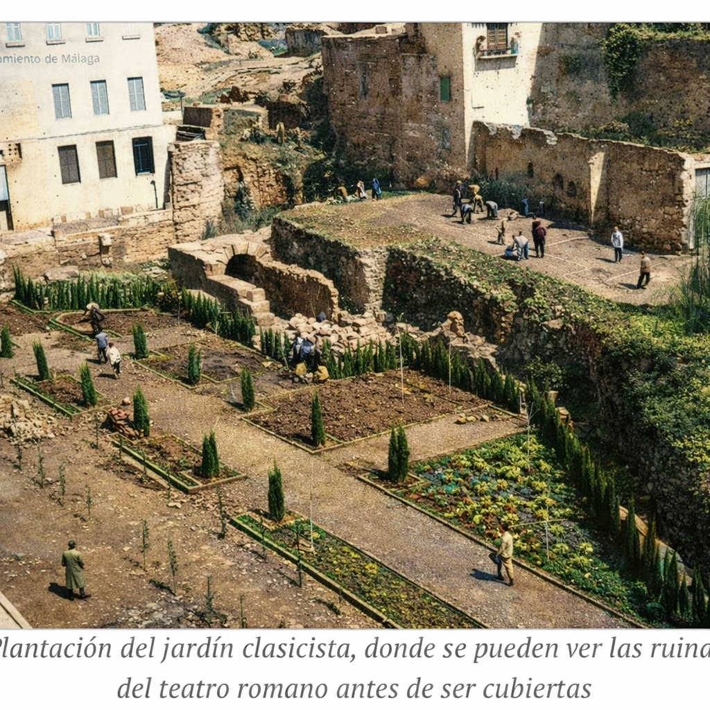 - Plantación del jardín clasicista, donde se pueden ver las ruinas del teatro romano antes de ser cubiertas