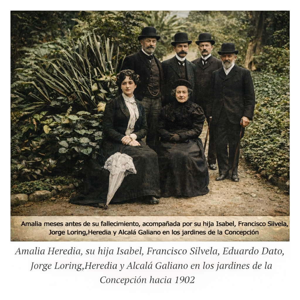 - Amalia Heredia, su hija Isabel, Francisco Silvela, Eduardo Dato, Jorge Loring,Heredia y Alcalá Galiano en los jardines de la Concepción hacia 1902