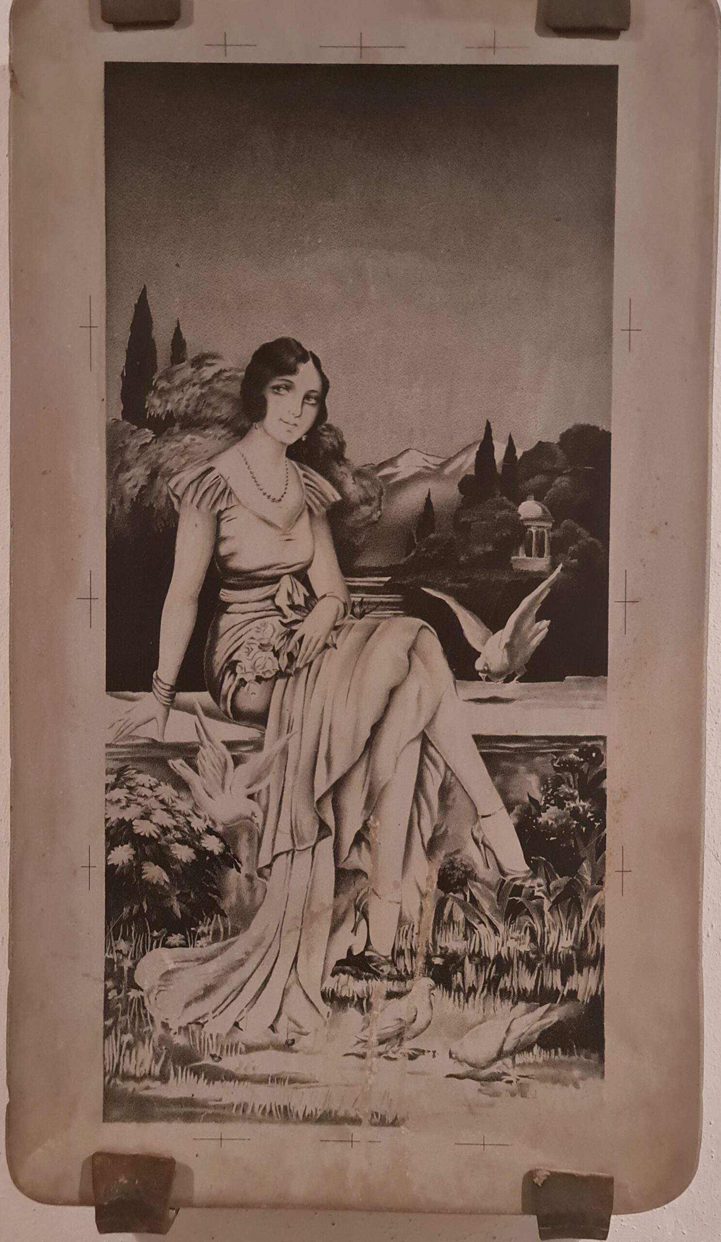 - Anónimo, siglo XX, Mujer sentada con fondo de los jardines de la Concepción, Piedra litográfica, Museo de Artes y Costumbres Populares