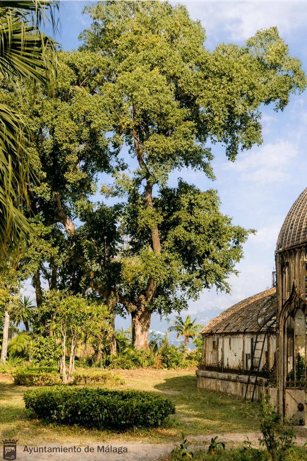 - Al fondo de los jardines había canastillos de flores, árboles exóticos y españoles, una pradera de césped, y un grandioso invernadero de hierro y cristal, con plantas, surtidores de agua, mesas y asientos rústicos de topiaria. Los denominados canastillos deben referirse a los maceteros de cerámica con forma de canastas, realizados en las fábricas malagueñas de cerámica. El invernadero era el más grande de toda Málaga, lo que nos habla de la importancia de la botánica en los jardines. Construido en hierro y cristal sobre un basamento de obra, era muy parecido al de la Hacienda de San José, y su cúpula de estilo hindú se podría relacionar formalmente con el palacio real de Brighton en el Reino Unido.