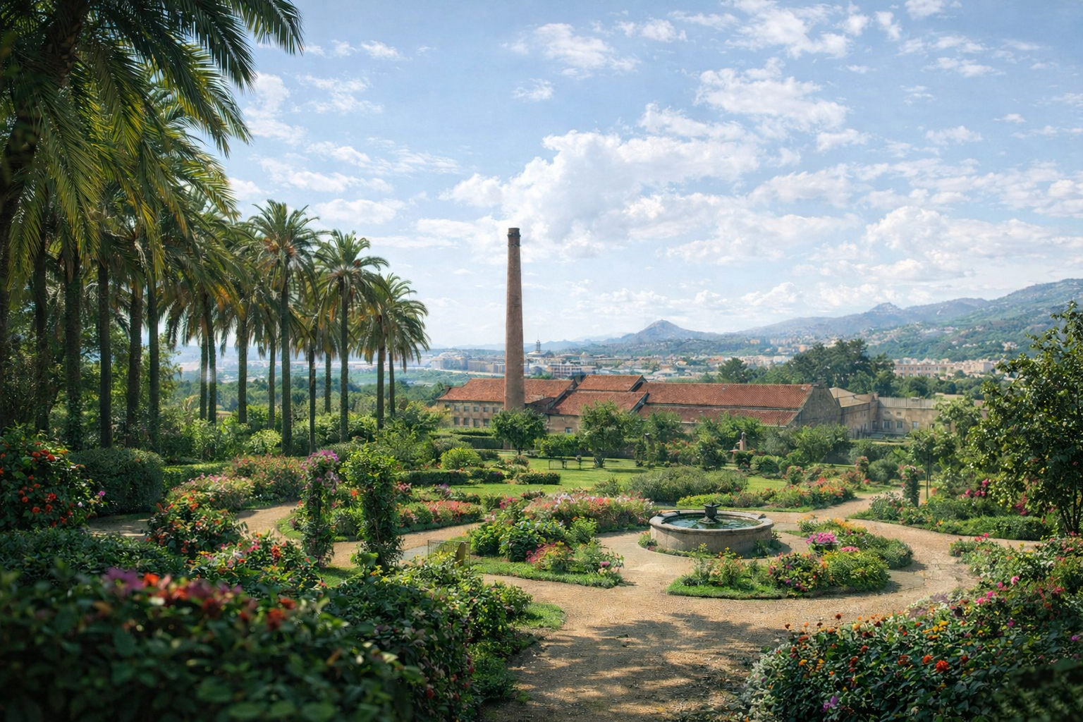 - Perspectiva de los jardines desde una de las chimeneas de la fábrica