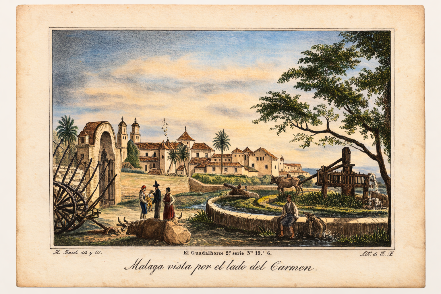 - Adrien Dauzats, 1836, Rijksmuseum. Vista de Málaga. Al fondo se ve la Vega de Málaga aún ocupada por huertas y haciendas