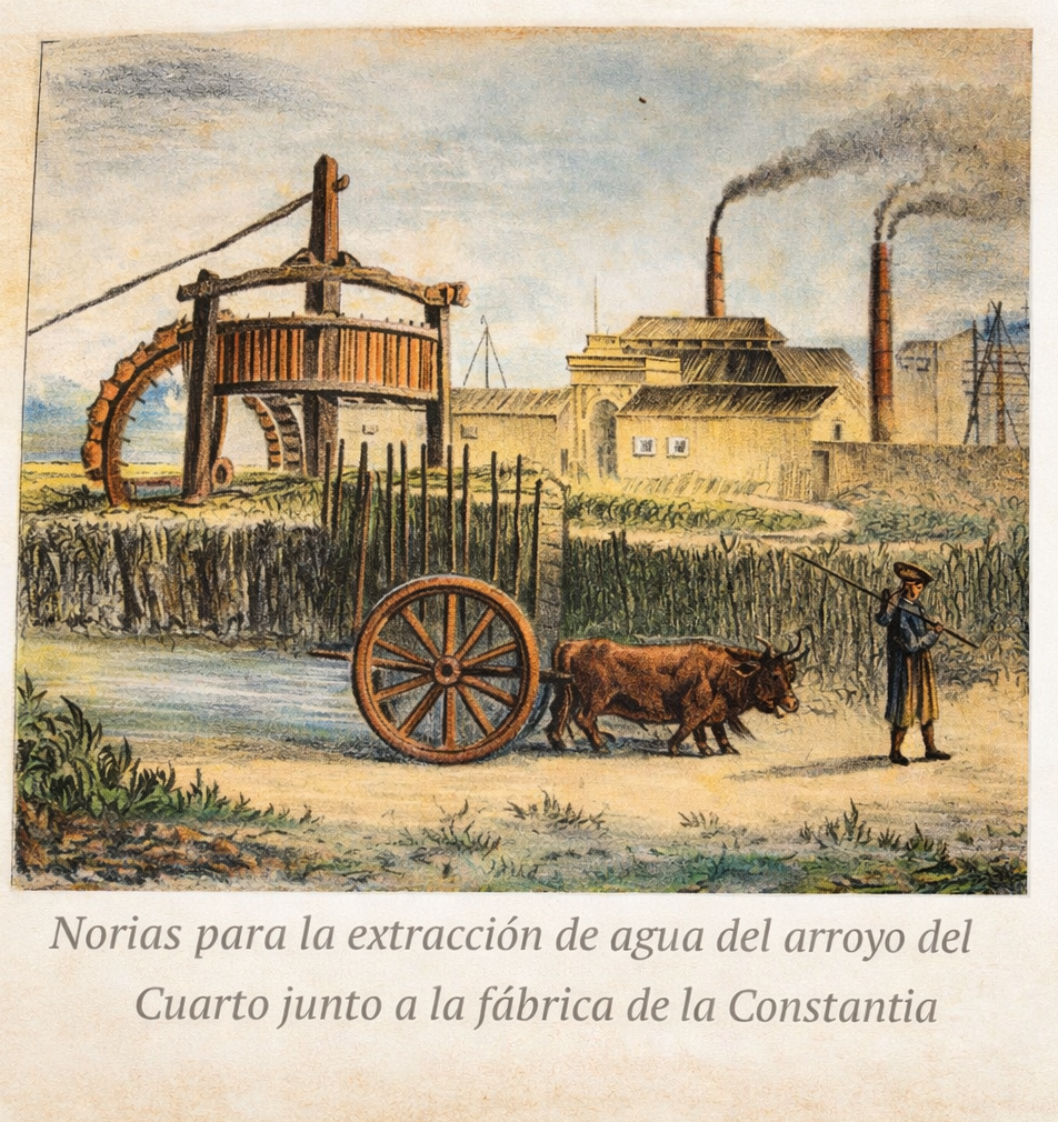 Los jardines se regaban con norias de sangre, que extraían agua de la capa freática del Arroyo del Cuarto, tal y como se pueden ver en dos láminas del Museo de Artes y Costumbres Populares de Málaga.