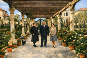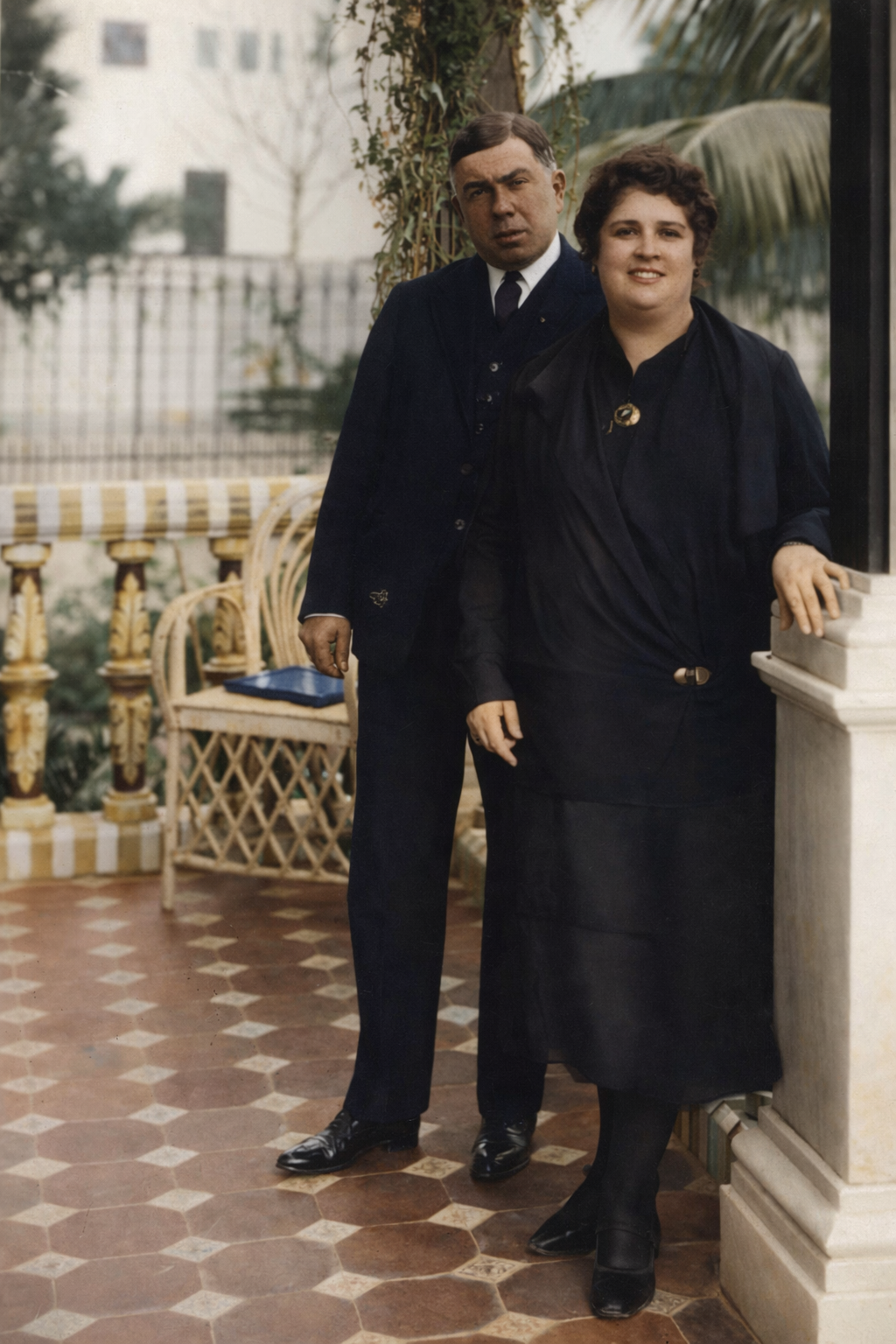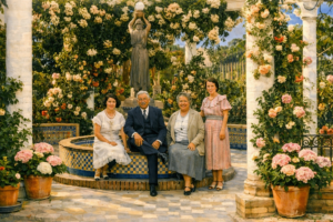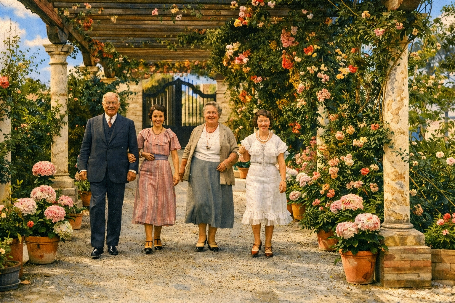 - Antoni9o Baena con su mujer y su hija en la pérgola del jardín
