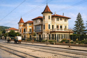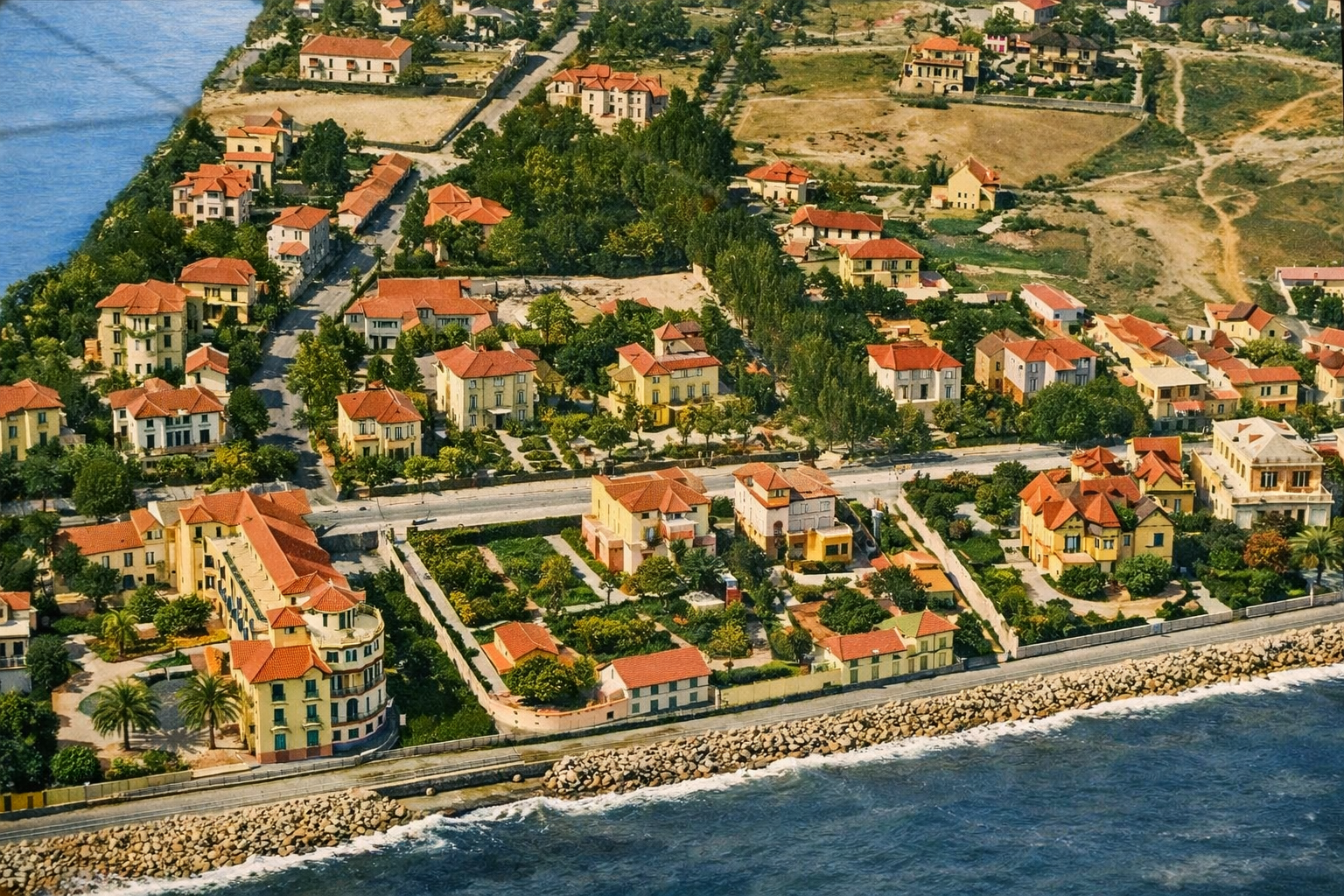 - Perspectiva occidental de la villa Santa Ana y los jardines